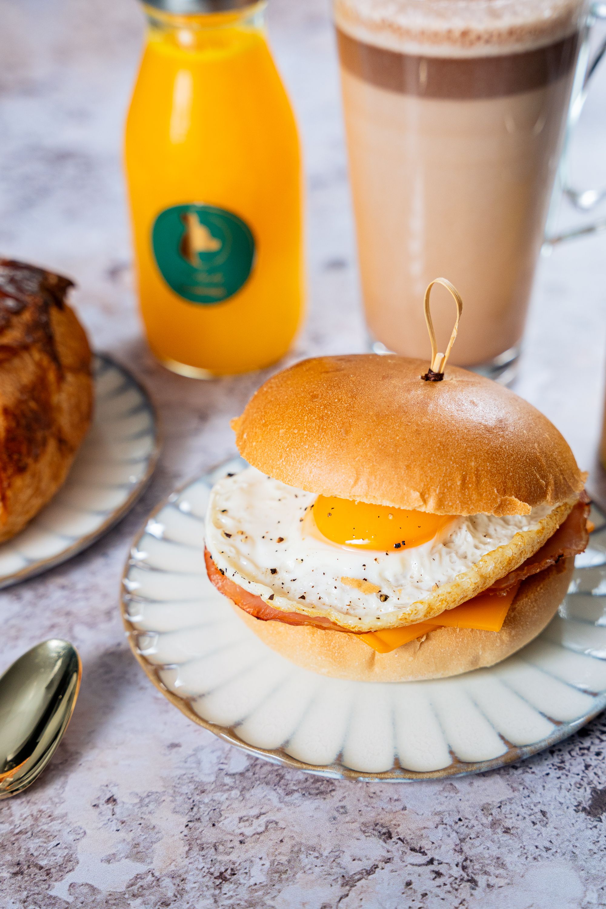 Un Egg muffin : pain toasté, cheddar, oignons frits, bacon grillé, œuf sur le plat.